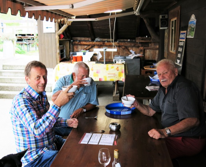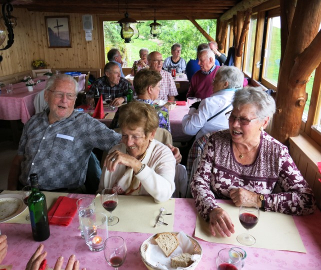 Das Mittagessen wurde als Selbstbedienungs-Buffet im Panorama-Stübli aufgebaut und serviert. Eine Grillauswahl bestand aus Schweinssteak, Pouletbrust und div. grillierten Würsten. Dazu wurden neun verschiedene Salate serviert. Bei den Desserts, wie etwa der Zuger Kirschtorte oder einer Meringue mit Rahm, blieben keine Wünsche offen. Der anschliessende Kaffee in den verschiedenen bekannten Innerschweizer Varianten, konnte auch ausserhalb in der Gartenwirtschaft, inhaliert werden. Es ging je länger je lustiger einher und die Stimmung war herrlich befreiend. Die Bauersleute und gleichzeitige Wirte der Alpwirtschaft - Mutter und Tochter Schuler, sowie der Mittarbeiter, Johann als der Grilleuer -, gaben sich alle Mühe, uns einen guten Service zu bieten, was ihnen auch umfassend gelang. Während dem sich die Einen nach dem Dessert und einem Kaffee nach Draussen in die schöne Alp-Landschaft zog, genoss Walter Bi…. einen gemütlichen Mittagsschlaf auf einer Bank im Panorama-Stübli. Gut Schnarchchchch!