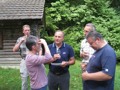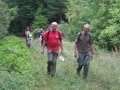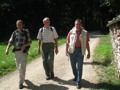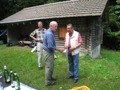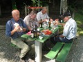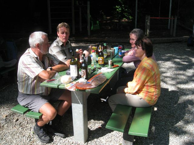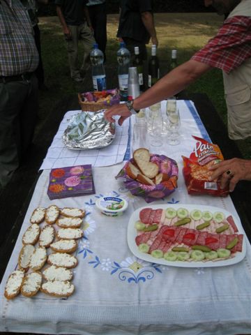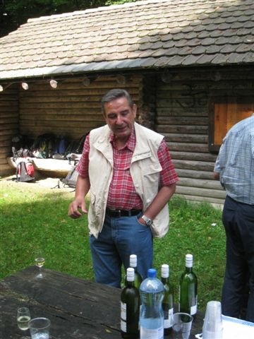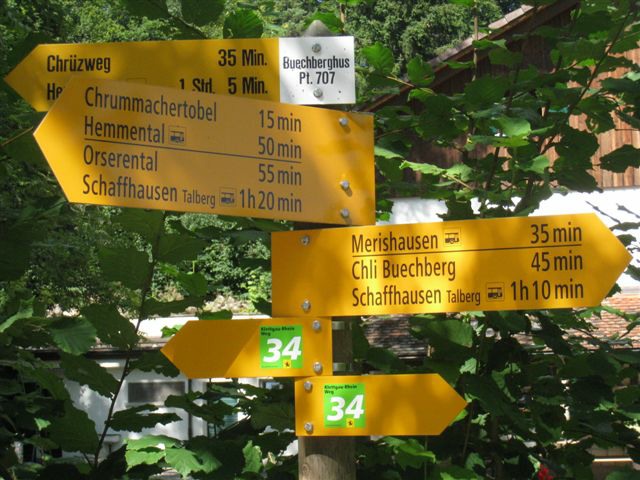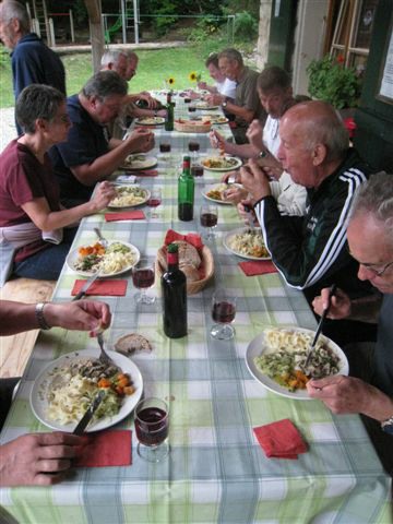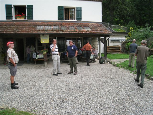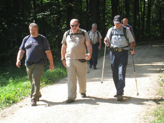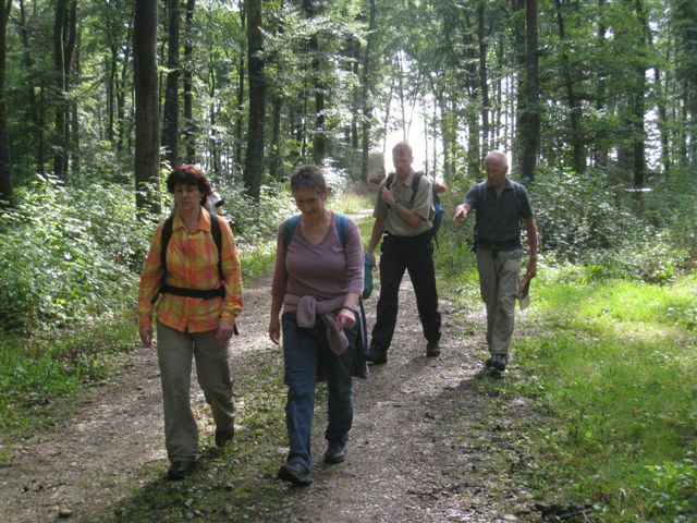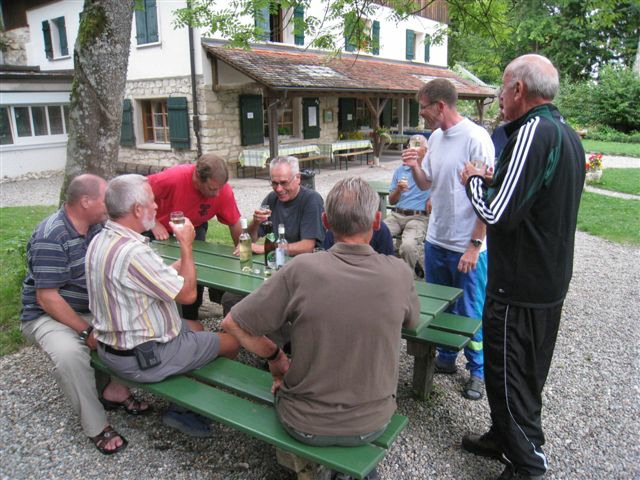 Auf heimischem Boden um 09.42 Uhr im Bahnhof Schaffhausen angekommen, wurden wir vom ehemaligen „Schugger“ Mökli Egon (er schreibt sich wirklich nur mit k) in Empfang genommen. Egon war ehemaliger Grenzwächter und war in Basel stationiert. Im Jahre 1962 (da war ich noch nicht einmal auf der Welt) trat er in die Polizeischule Basel-Stadt ein. Unserer Polizei blieb er nur zwei Jahre erhalten. Zuletzt war er auf dem Kannenfeld-Posten stationiert. Dann plagte ihn das Heimweh und er ging zurück in seinen geliebten Kanton Schaffhausen, wo er der Stadtpolizei Schaffhausen beitrat. Seit einigen Jahren ist er nun im wohlverdienten Ruhestand. Anschliessend begaben sich einige, in den unter dem Bahnhof gelegenen grossen Migros-Markt, um wie jedes Jahr etwas zum Bräteln etc. einzukaufen. Den Senf postete diesmal Schwalm Johann. Danach liefen wir zum nahegelegenen Busbahnhof und bestiegen den Bus Nr. 3 in Richtung Hemmental. Bei der Bushaltestelle ‚Sommerwies’ stiegen wir dann aus. Zum Wetter ist zu sagen, dass wir wieder einmal richtig Glück hatten. Mehrheitlich war es sonnig mit einigen wenigen Wolken vermischt, bei angenehmen Wandertemperaturen. Nach dem Bushalt nahmen wir einen kurzen Anstieg unter die Füsse. Dabei musste man aufpassen, dass man nicht ausrutschte, waren doch die Steine und Wurzeln nach vorhergehenden Regenfällen recht glitschig. Auf der Höhe angekommen, liefen wir quer durch den Wald bis zu einer Hütte. Die Örtlichkeit nennt sich ‚Birchstegli’. Dort sahen wir schon von weitem ein Mann, welcher auf einem Tisch Speis und Trank herrichtete. Dort angekommen, stellte uns Mökli Egon den Mann vor, welcher dort am auftischen war. Dabei handelt es sich um Winter Otto, ebenfalls ein ehemaligen „Schugger“ der Stadtpolizei Schaffhausen und auch er befindet sich im verdienten Ruhestand. Der hervorragende Apéro bestehend aus Weiswein (Räcke Dorn / Riesling-Silvaner aus Gächlingen), Mineralwasser, Fleischplatte mit Käse, Brot war hervorragend und wurde von Mökli Egon und Winter Otto gespendet. Sie bekamen von uns einen grossen Applaus und Geiser René überreichte ihnen nebst einem kräftigen Händedruck je ein Pack Basler Leckerli. Hier an dieser Stelle von uns allen nachmals ein herzliches Dankeschön an euch Beide. Mökli Egon hat uns noch ein Foto gezeigt, sozusagen als Beweis, dass er einmal bei der Basler Polizei gearbeitet hat. Auf dem weiteren Weg wurden wir dann von Winter Otto begleitet. Nach einer Marschzeit von ca. 20 Minuten, hörten wir plötzlich eine männliche Stimme durch den Wald rufen. Es war Mökli Egon. Was war passiert? Winter Ottto hat vergessen ihm seinen Autoschlüssel zu übergeben und er ist uns die ganze Zeit hinterher gelaufen. Nach der Schlüsselübergabe liefen wir dann weiter durch den Wald und über eine Ebene den ‚Randen’ weiter. An einer Weggabelung trennten sich dann Alex, Esther, Monika und ich von den anderen. Otto lief mit dem Rest der Gruppe einen anderen, längeren Weg. Wir vier nahmen eine Abkürzung und nach ca. 20 Minuten standen wir plötzlich vor dem Buchberghaus. Winter Otto als Präsident und Mökli Egon als Verwalter sind übrigens beide im Vorstand des Buchberghauses, welches zu den Naturfreunden der Sektion Schaffhausen gehört. Bis der Rest der Gruppe nach ca. 45 Minuten vor der Hütte eintraf, hatten wir es uns schon recht gemütlich gemacht und die erste Flasche Bier hatte schon den trockenen Hals befeuchtet. Egon war vor uns mit dem Auto bei der Hütte angekommen. Er begann damit die Feuerstelle in Betrieb zu nehmen. Nach dem Eintreffen unserer Kollegen genossen wir vor der Hütte die Sonne bei Speis und Trank und es wurde dabei der eine oder andere Witz erzählt. Es war so richtig gemütlich und es herrschte eine wunderbare Stille vom Wald her. Am Nachmittag konnten wir dann noch das Hüttenwart-Ehepaar Iris und Tobias begrüssen. Vor dem Nachtessen liefen Beni, Alex, Esther, Johann und ich in ca. 15 Minuten auf einem geraden Weg einmal um den Buchberg. Nach dem Bezug der schönen Zimmer, welche neu renoviert worden sind und einer Dusche, nahmen wir vor dem Nachtessen noch den Apéro ein, welcher vom Polizeiturnverein spendiert wurde. Prost und vielen Dank dafür. Um 19.00 Uhr wurde uns von Iris und Tobias das Nachtessen serviert. Dies konnten wir dank dem Föhn draussen vor der Hütte einnehmen. Die beiden servierten uns breite Nudeln mit Geschnetzeltem an einer Pilzrahmsause, sowie Rüebli und Zuccetti. Das Essen mundete hervorragend. Den beiden Köchen möchten wir von uns allen ein grosses Lob aussprechen. Nach dem Hauptgang gab es zum Dessert einen Bienenstich (tat nicht weh) sowie Kaffee. Der Kaffee wurde von der Saunakasse spendiert. Danke schön Toni. Kurz nach Mitternacht gingen die letzten zu Bett und genossen mehr oder weniger die Nacht unter den nordischen Bettdecken. Andere konnten einfach nicht ruhen und hatten in der Nacht noch Arbeit mit Bäume sägen etc. Am anderen Tag um 07.30 Uhr standen die meisten auf um die Morgentoilette zu verrichten. Das Morgenessen war um 08.30 Uhr angesetzt. Nach dem Packen der Rucksäcke machten wir uns um ca. 09.30 Uhr auf den Abmarsch. Davor bedankten wir uns bei Iris und Tobias für das hervorragende Essen und die tolle Gastfreundschaft mit einem kräftigen Applaus. Ich kann Euch allen das Buchberghaus nur empfehlen. Wer mehr darüber erfahren möchte kann dies im Internet auf der Homepage www.buchberghaus.ch tun. Eine telefonische Reservierung kann man über die Tel-Nr. 052 / 625 89 63 bei Frau Oertli vornehmen. Die Wanderung führte uns nach einem kurzen Abstieg in das kleine Dorf Merishausen hinunter. Danach liefen wir dort im Wald auf einem immer leicht ansteigenden Weg entlang. Wenn es rauf geht, dann geht es dann irgend einmal wieder runter. Das war auch diesmal der Fall. Bei einer Waldlichtung, kurz vor einem Aussenquartier von Schaffhausen schalteten wir einen kurzen Halt ein. Dabei entkorkte Schwalm Johann eine Flasche Weisswein (es war unsere le