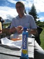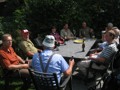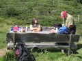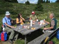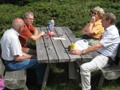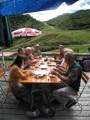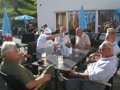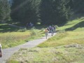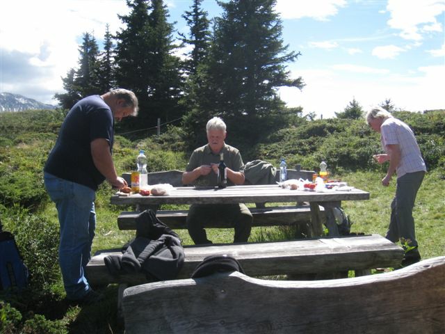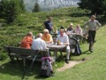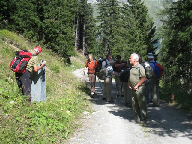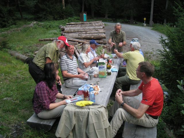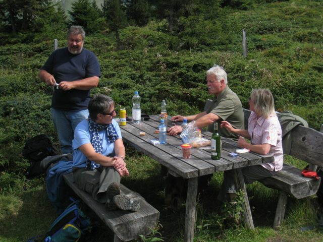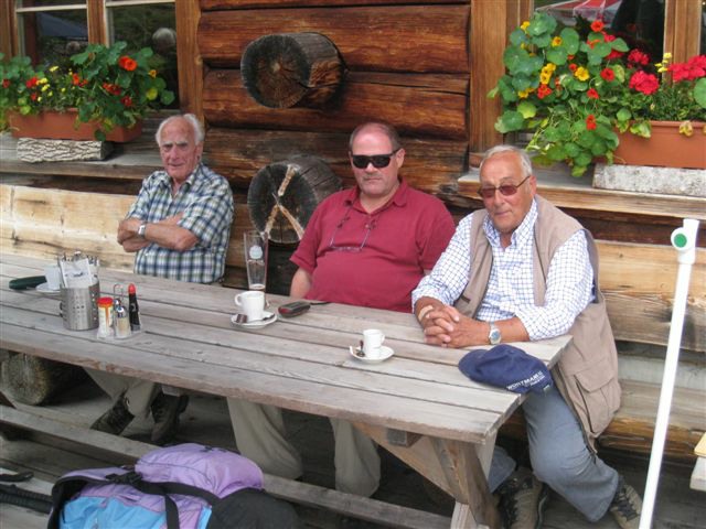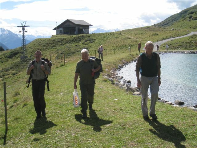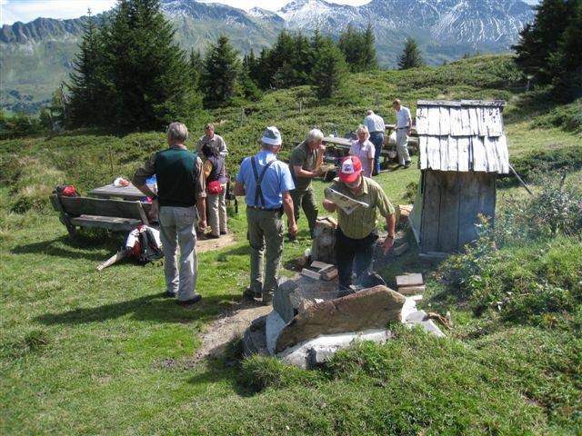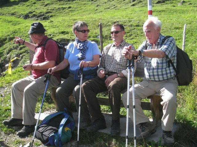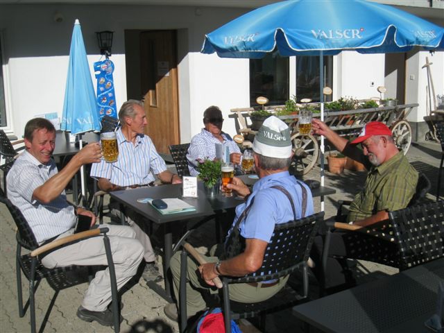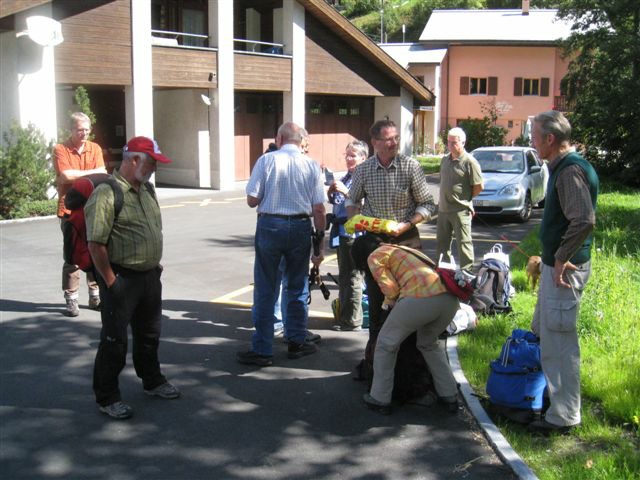 Im dortigen Coop-Center kauften wir unser Zmittag ein. Für den Gruppensenf der Marke Thomi, mild, blau war logischerweise ich besorgt. Geiser René, Vaihinger Edi, Voegelin Jürg und Vaterlaus Ernst fuhren mit dem Sessellift vorweg, wobei René beim Mittagshalt schon einmal das Feuer bei der Grillstelle entfachte. Söll Toni und Elsbeth fuhren mit dem Postauto von Churwalden direkt nach der Lenzerheide und von dort mit dem Sessellift und nach kurzem Fussmarsch direkt zum Hotel Tgantieni. Nach dem Einkauf fuhren auch wir mit dem Sessellift auf die Stäzeralp. Unterwegs sahen wir mehrere Murmelis aus ihren Bauten hervorkommen und umherrennen. Oben angekommen erreichten wir nach nur ca. 300 Metern den Grillplatz „Grill Stätz“. Ich muss sagen, dass war wirklich ein toller Grillplatz mit Tischen und Stühlen, einer Feuerstelle mit genügend Feuerholz an Lager, einem Beil und sogar einem Abfalleiner. Dort an diesem lauschigen Plätzchen nahmen wir alle unser Zmittag ein und zogen so richtig die Sonnenstrahlen in uns hinein. Nach dem Mittagshalt knipsten wir noch zur Erinnerung ein Gruppenfoto. Danach marschierten wir immer leicht abwärts und nur wenige hundert Meter entfernt bis zur Alp Stätz einem Restaurant auf 1824 m.ü.M. liegend. Auch dorthin wurden wir immer wieder von pfeifenden Murmelis begrüsst. Dort warteten Ernst, Edi und Jürg auf uns, welche ihr Mittagessen im Restaurant eingenommen haben. Wir bestellten fast alle einen Hauskaffee mit ordentlich etwas drin (Seitenwagen). Die hübsche Servierdame sagte uns aber nicht was alles drin war. Danach öffnete Esther wiederum ihr „Schatzchäschtli“, Rucksack genannt und entnahm aus diesem einen frischen, selbstgebackenen Russenzopf hervor. Dieser mundete natürlich herrlich zum Kaffee. Wie ich von Esther in Erfahrung bringen konnte, hat sie früher einmal eine Lehre als Bäckerin und Konditorin absolviert. Dies ist uns jetzt zugute gekommen. Vielen herzlichen Dank Esther. Nach dem Kaffeehalt wanderten wir in gemütlichem Tempo auf dem einmal leicht abfallenden, dann wieder leicht ansteigenden Höhenweg via Spoina in den Globiweg einmündet bis zum Ziel des 1. Tages, nämlich dem Hotel Tgantieni auf einer Höhe von 1790 m.ü.M. Dort trafen wir um ca. 17.00 Uhr ein. Das Hotel Tgantieni wird vom verunglückten, ehemaligen Skirennfahrer Silvano Beltrametti, seiner Ehefrau, sowie seinen Schwiegereltern geführt. Vor dem Zimmerbezug und einer erfrischenden Dusche stärkten wir uns auf der herrlichen Sonnenterasse mit Bier, Wein, etc. Dort erzählte uns René, dass er im Zug seine Jacke hat liegen lassen. René verkündete uns, dass das Nachtessen um 19.00 Uhr eingenommen wird. Nach der herrlichen Dusche trafen wir uns um 18.30 Uhr im Restaurant zum Apéro. Wie schon vorgängig erwähnt wurde uns pünktlich um 19.00 Uhr das Nachtessen von der charmanten Ehefrau von Silvano Beltrametti serviert. Sie tischte uns nacheinander Mozzarella mit Tomatensalat, eine Gemüsecremesuppe und als Hauptgang ein Kalbsgeschnetzeltes „Zürcher Art“ mit Nudeln auf. Abgerundet wurde das Essen mit einem feinen Caramelchöpfli mit Rahm. Das Nachtessen war wirklich hervorragend. Die Getränke Wein, Wasser etc. wurden von einem unbekannten Sponsor übernommen. Wir sagen demnach alle vielen herzlich Dank an den unbekannten Sponsor. So um ca. 23.00 Uhr begaben sich dann alle in ihr Bett, war doch um 08.00 Uhr schon wieder das Morgenessen angesagt. Auch das Morgenbuffet war erstklassig und so konnten wir gestärkt den 2. Tag in Angriff nehmen. Der Himmel war zum Teil bewölkt und zwischendurch nieselte es leicht. Um ca. 09.30 Uhr wanderten wir leicht abwärts bis zur Bergstation des Sesselliftes, welcher uns nach der Lenzerheide hinabführte. An der Talstation angekommen, fing es dann an leicht zu regnen. Im Dorf kauften einige dann wiederum im Volg den Zmittag ein. Ein Teil der Gruppe fuhr mit dem Postauto von der Lenzerheide bis nach Thusis. Der andere Gruppenteil fuhr ebenfalls, aber mit einem anderen Postauto von der Lenzerheide bis ins Dorf Mundain. Von dort aus nahmen wir die ca. 2-3 Stunden dauernde Wanderung unter die Füsse. Diese führte uns auf einem zuerst flachen Stück, dann etwas steil abfallenden, später stark ansteigenden Weg, unterbrochen von einem Tunnel bis zu einem Grillplatz in einer Waldlichtung. Dort nahmen wir unser Zmittag bei jetzt wieder herrlichem Sonnenschein ein. Der Rotwein, sowie etwas Salzgebäck wurde von Klara und Dieter Müller spendiert. Euch beiden vielen Dank dafür. Nach dem Mittagshalt nahmen wir das letzte Teilstück zu Fuss in Angriff, welcher uns in das kleine Dorf Scharans führte. Unterweg begegneten wir vielen Bikern, die entweder mühsam den Berg emporfuhren, oder auf der rasanten Abfahrt ins Tal stürzten. Im Dorf Scharans angekommen konnten wir feststellen, dass das nächste Postauto erst wieder in einer Stunde kam. In der Folge kehrten wir in einem nahegelegenen Café ein. Dort waren jedoch alle Tische (3) schon besetzt. Doch die Besitzerin sagte zu uns, dass wir uns an den grossen Tisch in ihrem privaten Garten hinsetzen können. Ich muss schon sagen, das war aber allererste Klasse und dies macht auch nicht jede oder jeder. In der Folge liessen wir es uns dort im Garten bei Bier und Rittergold, sowie Erdnüssen gut gehen. Um 15.10 Uhr fuhr dann das Postauto neben einem Brunnen auf dem Dorfplatz vor. Dieses führte uns von Scharans nach Thusis. Beim dortigen Bahnhof trafen wir wieder mit dem anderen Teil unserer Gruppe zusammen. Wie ich von Cello Conrad (Eingeborener von Müstair) erfahren habe, liessen sie es sich in einem Restaurant ebenfalls gut gehen, dies bei Hirschpfeffer etc. Nach kurzer Zeit fuhr dann auch schon der Zug ein, welcher uns nach Chur brachte. Dort mussten wir zügig umsteigen, weil der Zug eine leichte Verspätung aufwies. Am 1. Tag hat Söll Toni sein Halbtax-Abonnement im Postauto auf dem Weg von Chur nach der Lenzerheide verloren. Diese wurde glücklicherweise wieder gefunden, abge