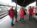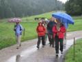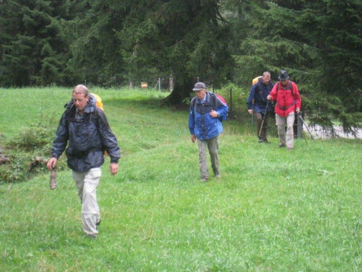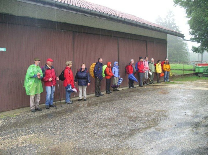 Wir liefen an diesem rechts vorbei und sahen aber das linke Ufer aufgrund des Nebels und Regens nicht. Beni erzählte mir, dass er vor ein paar Wochen davor mit seiner Frau Monika bei herrlichem Wetter da war (siehe Foto). Das Wetter wurde immer ungemütlicher und nach einem kurzen Aufstieg ging es dann steil bergab nach Tramelan. Am zweiten Tag betrug die Marschzeit ca. 3 Stunden. Dort beim Bahnhof warteten Kuno und Ernst auf uns im trockenen. Auch Bethli und Bruno liefen das letzte Teilstück nicht mehr. Der steile Abstieg zum Bahnhof Tramelan wäre auch für sie wegen den Gelenken „Gift“ gewesen. Von uns war jede und jeder ziemlich durchnässt. Am Bahnhof in Tramelan legten dann einige einen Striptease hin und zogen sich trockene und warme Ersatzkleider an. Nach einem Apéro bestiegen wir um 1601 Uhr den Zug nach Basel. In Tavannes und Moutier mussten wir noch zwei Mal umsteigen bis wir um 1756 Uhr in Basel ankamen. Unterwegs wurde noch der letzte Alkohol (Bier, Wein, etc.) vernichtet. In Basel angekommen verabschiedeten wir uns voneinander. Die meisten von uns sind direkt nach Hause gegangen. Eines muss hier noch lobend erwähnt werden. Trotz zum Teil misslichen Wetterverhältnissen, herrschte eine ausgelassene und fröhliche Stimmung. Wir haben sehr viel gelacht und ich möchte die Witze und Sprüche von Schmid Alexander, Stäger Walti und in diesem Jahr auch von Bucheli Edi nicht missen. Wir hoffen einfach, dass Petrus im nächsten Jahr wieder besseres Wetter bringt. Gegen ein paar Sonnenstrahlen hätte sicher niemand etwas dagegen. Abschliessend möchte ich mich im Namen aller Teilnehmerinnen und Teilnehmer bei Geiser René für die wieder einmal mehr perfekt organisierte Bergwanderung der Ausgabe 2012 herzlich bedanken. Aufgrund der Wetterverhältnisse habe ich dieses Jahr weniger Fotos geschossen. Nebel und Regen zu fotografieren ist eben nicht so lustig. Stäger Walti sagte zu mir, schreib doch einfach, dass es ein perfektes Wellness-Wochenende war.
