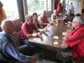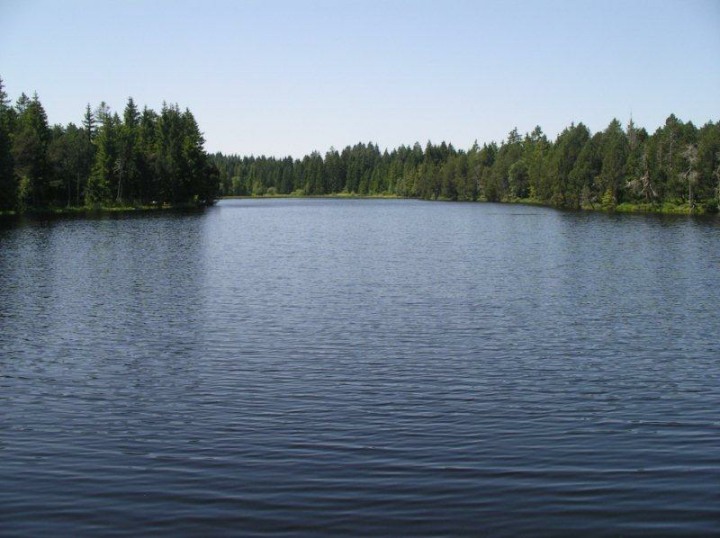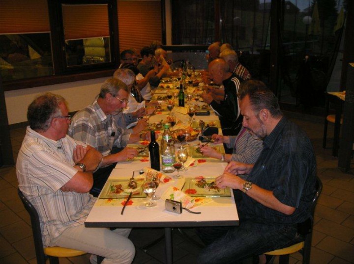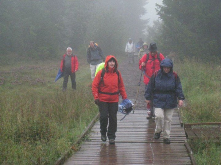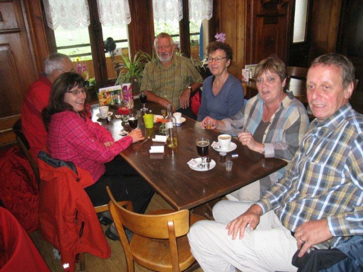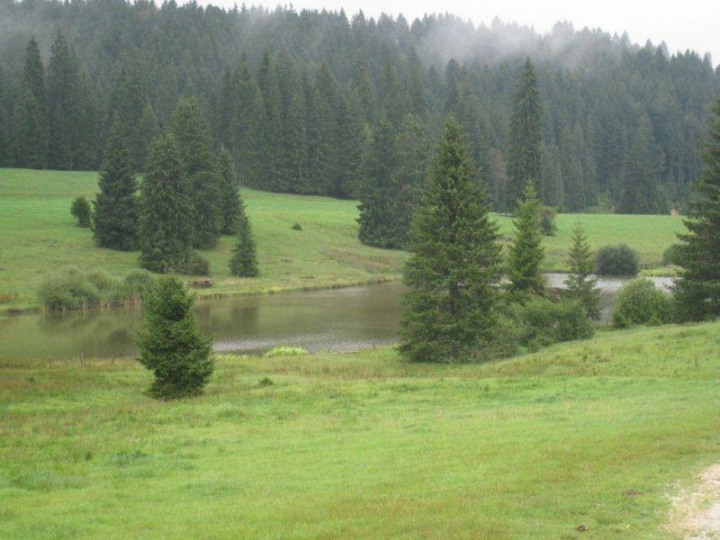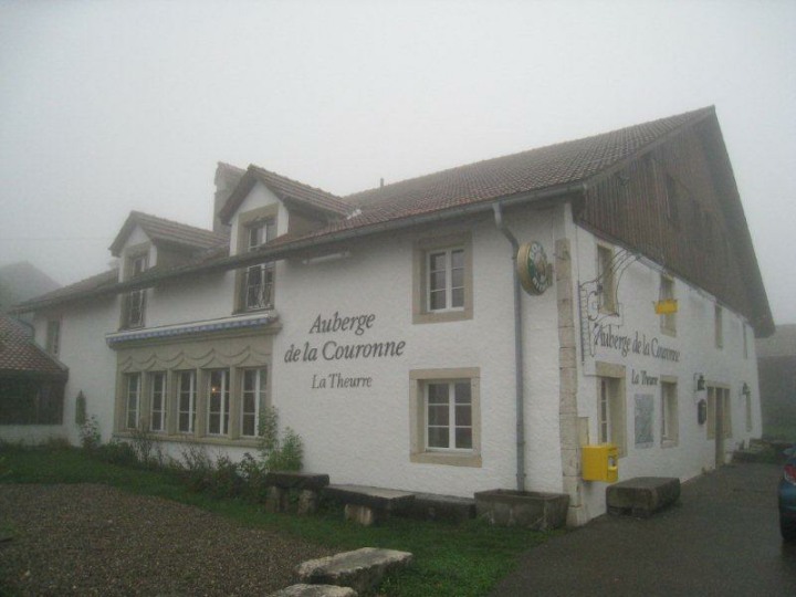 Ca. 1100 Uhr trafen wir im Auberge de La Couronne in la Theurre ein. Wir waren froh, denn es war kühl und regnete immer wieder, mal schwächer, mal stärker. Im Restaurant vermissten wir Kuno Höfler und Ernst Vaterlaus. Was war passiert? Nichts war passiert, denn die beiden sind einfach mit dem Postauto noch eine Extraschlaufe von zwei Haltestellen gefahren. Stäger Walti meinte, dass in Magglingen sicher ein Kurs angeboten wird, wie man lernt, wo man aussteigen muss. Zum Mittagessen gab es eine Pilzschaumsuppe, oder einen Salat, Braten mit Kartoffelstock und Gemüse und wer wollte konnte sich noch ein Dessert hineinschlemmen. Das Essen wurde von einem stillen Spender übernommen und mit einem lauten und kräftigen Applaus verdankt. Stäger Walti (eidg. Dipl. Geschirrabräumer) räumte das Geschirr ab und trug es bis in die Küche. Nach dem Essen stand Bucheli Edi auf und bedankte sich nochmals bei René und allen anderen. Danach trug er ein Gedicht vor, dass davon handelte, wie ein Schweizer sein sollte, aber nicht ist. Abschliessend sangen wir das Turnerlied, was für mich eine Premiere war. Geiser René bedankte sich bei Käsermann Beni, welcher mit ihm die Tour abgelaufen ist und alles rekognosziert hat. Merci Beni auch Dir für Dein Engagement, hast Du es doch als Frischling unter den Pensionären doch immer so streng. Mit wieder mehr oder weniger trockenen Kleidern nahmen wir das letzte Teilstück in Angriff. Schon nach kurzer Zeit kamen wir an dem Moorsee Etang de la Gruère.