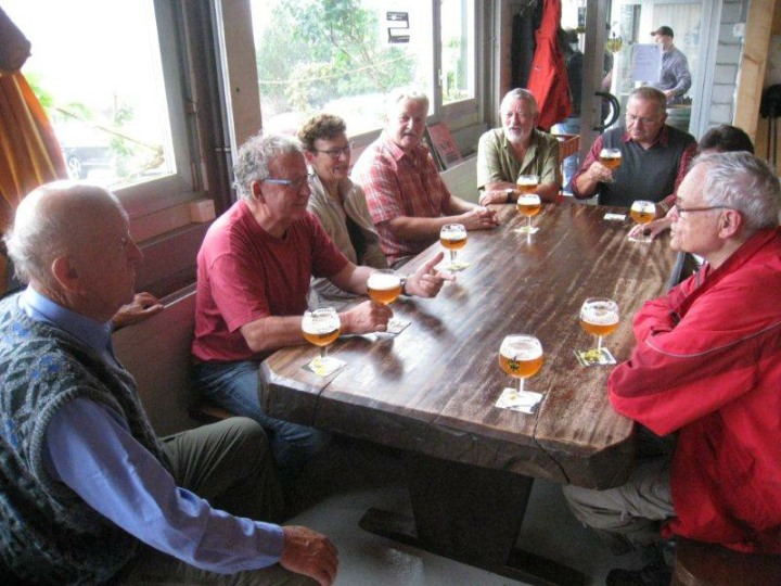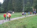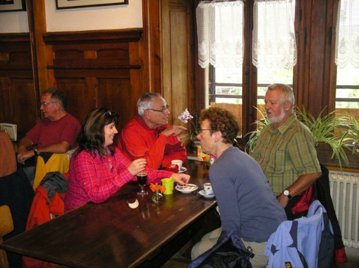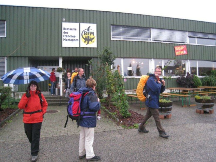 Anschliessend setzten wir unsere Wanderung wieder fort in Richtung Bémont. Unterwegs mussten wir wieder in ein angeschriebenes Haus Auberge Du Sapin einkehren, weil es wieder anfing stärker zu regnen. Das war noch interessant. Immer wenn wir in einer Beiz verweilten, regnete es stärker und beim wandern nieselte es nur leicht. Bei einem kurzen Halt erzählte uns der Bärenführer Geiser René, dass er am Samstag, 08. September 2012 seinen runden 80. Geburtstag feiern kann. Lieber René, im Moment deines Geburtstages schreibe ich gerade diese Zeilen und ich gratuliere Dir im Namen aller ganz herzlich zu deinem runden Geburtstag. Hoffentlich kannst Du noch so manche Bergwanderung für den Polizei-Turnverein organisieren. Wir wünschen Dir natürlich auch gute Gesundheit, welche es dazu braucht. Bei diesem Halt erklärte uns René, dass er uns gerne zu einem Bier in Saignelégier in die Brasserie des Franches-Montagnes einladen möchte. Vielen Dank René für die spontane Einladung.