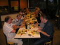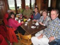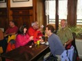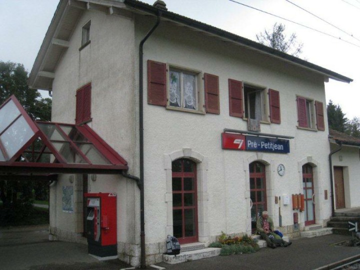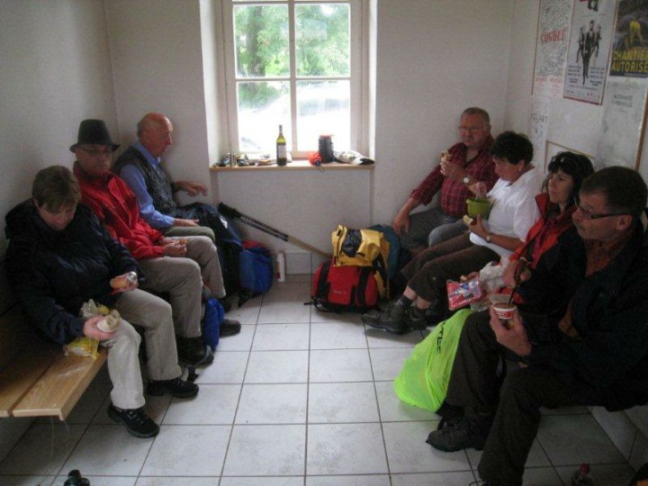 Diese wurde gerade so richtig kräftig eingeheizt und dampfte vor sich hin. Beim erwähnten Bahnhof nahmen wir vor und im Bahnhofsgebäude (kleines Sääli) unser mitgenommenes Mittagessen ein. Der obligate Senf durfte da natürlich auch nicht fehlen. Nach der Verpflegung verschoben wir nur 20 Meter bis zum Auberge Petitjean und genehmigten uns dort im trockenen einen Kaffee avec. Zusätzlich servierte uns Bucheli Edi und Fini einen selbstgebrannten und mitgebrachten Kirsch-Honig Schnäpsle (42 %, aus dem Jahre 2010). Euch beiden vielen Dank dafür.
