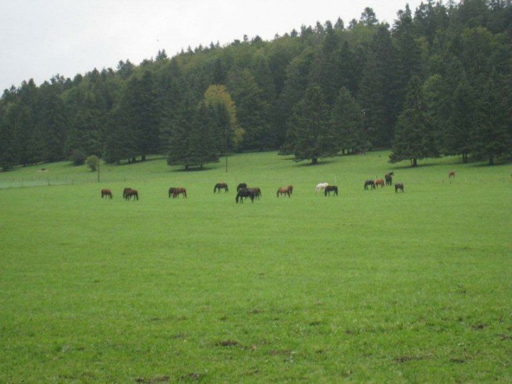Nach dem Umtrunk in der Brauerei verschoben wir uns an unser Endziel, nämlich zum 3-Sterne Sporthotel CRISTAL, mit Eishalle, Wellness und SPA, Hallen- und Aussenbad etc. Bei der Hotelbuchung war auch ein Gratiseintritt ins Hallenbad inklusive. Um 1900 Uhr trafen wir uns im Restaurant zum Apéro. Um 1930 Uhr wurde zu Tisch gebeten. Als Menü wurde uns ein Vorspeisenteller (weiss nicht mehr was alles drauf war) serviert. Jedenfalls war es sehr gut. Danach folgte der Hauptgang (Piccata mit Risotto und Gemüse. Eine feine Apfelwähe mit Glace zum Dessert rundete das wirklich gute Nachtessen ab. Während dem Essen erhob sich der Präsident Schmid Alexander und richtete ein paar Worte des Dankes an den Bärenführer Geiser René, sowie an alle anderen Teilnehmerinnen und Teilnehmer der diesjährigen Bergwanderung. Die Getränke und der Kaffee wurden vom Polizei-Turnverein übernommen. Vielen Dank im Namen aller dafür. Danach erhob sich der „Landjäger“ Bucheli Edi (trug weisses T-Shirt mit der Aufschrift Landjäger) und bedankte sich bei Geiser René für die Organisation und gratulierte ihm schon einmal zum 80. Geburtstag. Als Geschenk überreichte er ihm ein Glas eigenen Honig. René verkündete, dass das Morgenessen am anderen Tag um 0800 Uhr eingenommen wird. Um ca. 2130 Uhr begaben sich die ersten zu Bett, während ein paar einen Jass klopften und andere noch einen Schlummertrunk zu sich nahmen. Am ersten Tag sind wir ca. 3 ½ Stunden, mit einer Höhendifferenz von ca. 150 Metern gewandert. Die Zimmer des Sporthotels CRISTAL waren sehr schön und modern eingereichtet. Das Hotel kann im Internet, auf der Homepage www.hotelcristal.ch angesehen werden. Am Samstag nahmen wir im Hotel pünktlich um 0800 Uhr das Morgenessen vom Buffet ein. Draussen war es neblig und es regnete. Um 0930 Uhr liefen wir beim Hotel ab. Bethli und Bruno Richner waren diesmal auch dabei. Am Anfang mussten wir eine kleine Steigung überwinden, vorbei an weidenden Kühen und für den Jura typisch, natürlich auch an Pferden.
