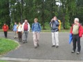 Unterwegs hat es leicht bis mittelstark geregnet. Beim Aussteigen war zum Glück nur noch leichtes Nieseln angesagt. Bethli und Bruno Richner, Kuno Höfler und Ernst Vaterlaus fuhren mit dem Zug weiter direkt bis nach Saignelégier. Die restlichen 14 Wanderinnen und Wanderer nahmen den Weg zu Fuss auf eher flachem Terrain durch Wälder und an einem See (Plain se Saigne) vorbei bis zum Bahnhof von Pré-Petitjean in Angriff. Unterwegs sahen wir noch eine stehende Dampflokomotive.