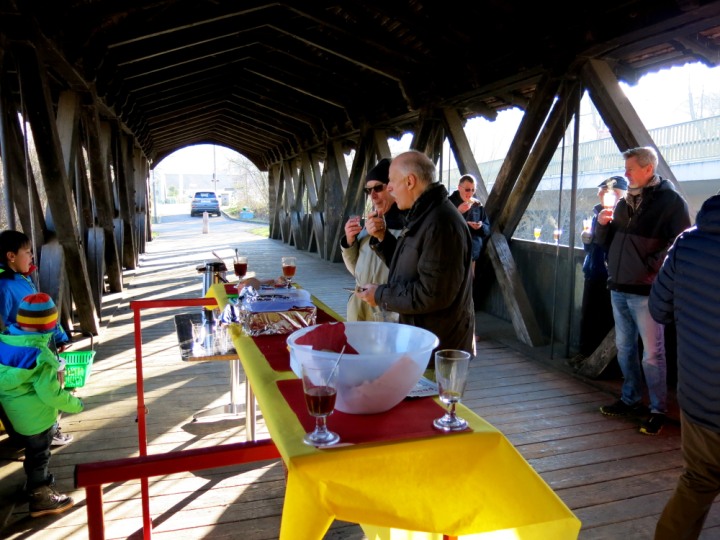 In mitten der gedeckten Holzbrücke, erwartete uns ebenso ein gedecktes Buffet, mit diversen Tranksamen und Häppchen. Der Wirt des fliegenden Restaurants, Walti Stäger mit seinen beiden Gross Kinder-Buben, überraschte uns auf die wohl, angenehmste Weise. Dementsprechend wurde die Wanderung, auch gerne mal unterbrochen, um an dem aufgebauten Buffet, Teil zu haben. Diese erste Wander-Ueberraschung, ist unserem neuen Vereinsmitglied, komplett und lückenlos, gelungen. Nach dieser Aufwärmung, konnten wir den Weg zum Clubhaus des FCP, gestärkt, weiter in Angriff nehmen.