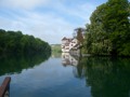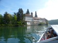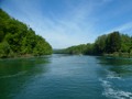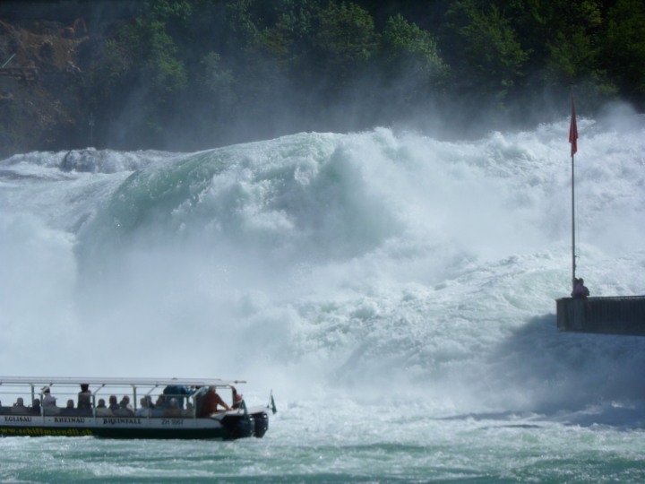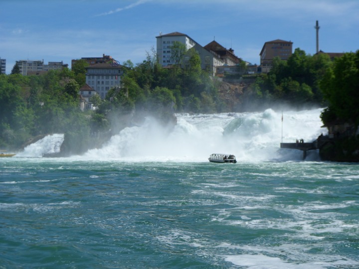 Pünktlich in der Herrgottsfrühe fanden sich die unentwegten Ausflugsgäste bei der Gartenstrasse ein. Um 0645 Uhr nachdem die sechzig Personen einen Platz im Car eingenommen hatten, fuhr der Doppelstock-Bus mit Thomas als unseren Chauffeur in Richtung Ostschweiz los. Die Fahrt führte lediglich ein kurzes Teilstück auf der Autobahn danach aber auf der Kantonsstrasse via Eiken – Laufenburg nach Koblenz-Gippingen. Dieses Teilstück dem Rhein entlang erlebten wir in dichtem Nebel. Die Stimmung unter den Teilnehmern im Car zu dieser Morgenzeit war noch etwas schläfrig und ruhig. Keine Stunde und wir trafen in Gippingen ein wo im Restaurant „Kreuz“ der Kaffee mit Gipfeli uns erwartete. Jetzt war auch der letzte „Morgenmu…“ in Stimmung gekommen und bereits um 0835 Uhr erfolgte die Weiterfahrt zum Kloster Rheinau wo die erste Ueberraschung uns erwartete. Die Organisation scheuten weder Müh noch Kosten. Nein es folgte das Umsteigen von dem Car auf zwei Langboote. Diese Flussfahrt führte von Rheinau aus nach dem Rheinfall. Unterwegs wurde ein Apero serviert und wir konnten die Fahrt auf dem Seitenarm des Rheins bei schönstem Sonnenschein einfach nur geniessen. Erna und René - ich kann nur sagen - die Ueberraschung war Euch gelungen und sämtliche Kollegen waren nur happi sich an der wunderschönen vorbeiziehenden Waldlandschaft zu erfreuen. Als krönenden Abschluss dieser Flussfahrt glitten die beiden Langboote zum Rheinfall in die Gischt, wo die Wucht und die Kraft der über die Felsen fallenden Wassermassen, eindrücklich erlebt werden konnten.